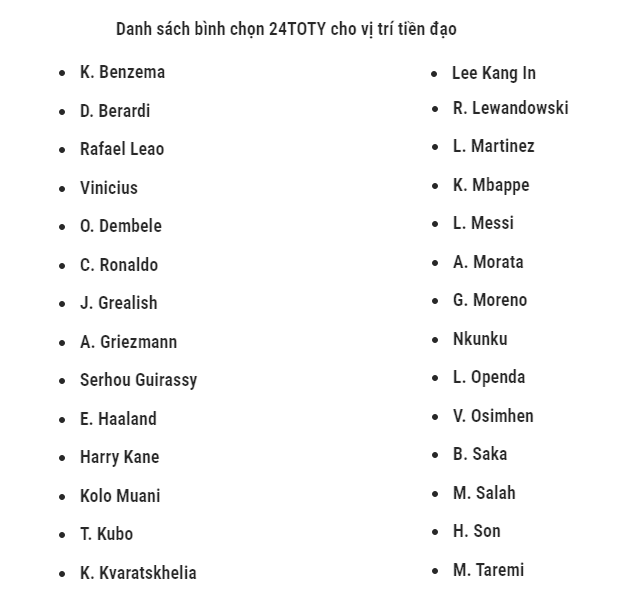 Cái tên đáng chú ý nhất trong danh sách chắc chắn là Ronaldo, hiện tiền đạo người Bồ Đào Nha là cầu thủ ghi nhiều bàn thắng nhất trong năm dương lịch 2023. Mặc dù chỉ thi đấu ở giải đấu Ả Rập nhưng thành tích và danh tiếng của anh chắc chắn sẽ vẫn chiếm được cảm tình của đa phần người tham gia bình chọn. Việc Ronaldo có được 1 vị trí trong 12 cầu thủ 24TOTY chính thức gần như là rất cao. Bên cạnh đó Messi, Mbappe cùng với Haaland sẽ cạnh tranh nhau ở hai vị trí còn lại ( do hàng công của đội hình thường là sơ đồ 433 )
