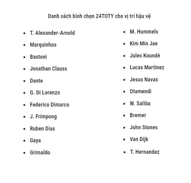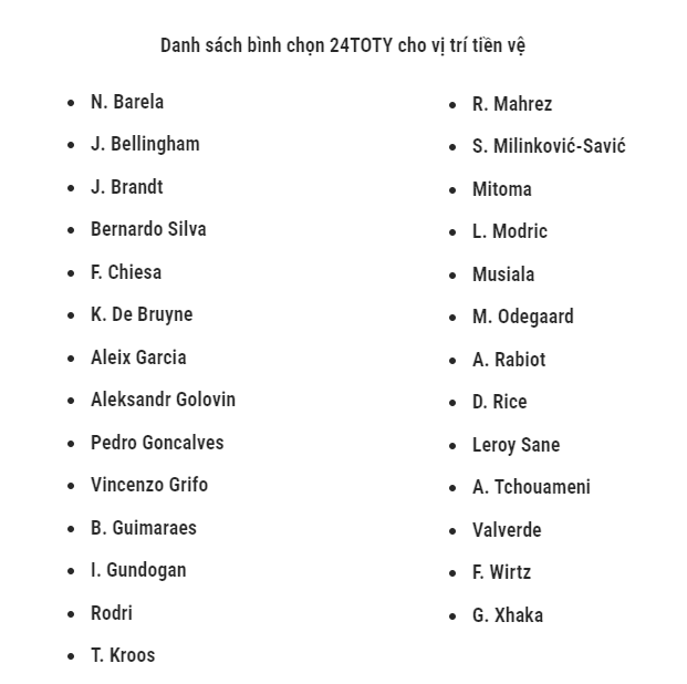 Và tất nhiên trước được tung ra thì người chơi ở các sever sẽ có quyền được bình chọn 12 cầu thủ tốt nhất để xếp vào đội hình chính thức TOTY, những cái tên còn lại sẽ được đẩy vào mùa giải 24 TOTY-N ( Team Of The Year Nominated ). Tất nhiên việc lựa chọn 11 cầu thủ gần như được lấy từ bên tựa game FC24 truyền thống, chỉ có cầu thủ thứ 12 là khác biệt của từng sever mà thôi.