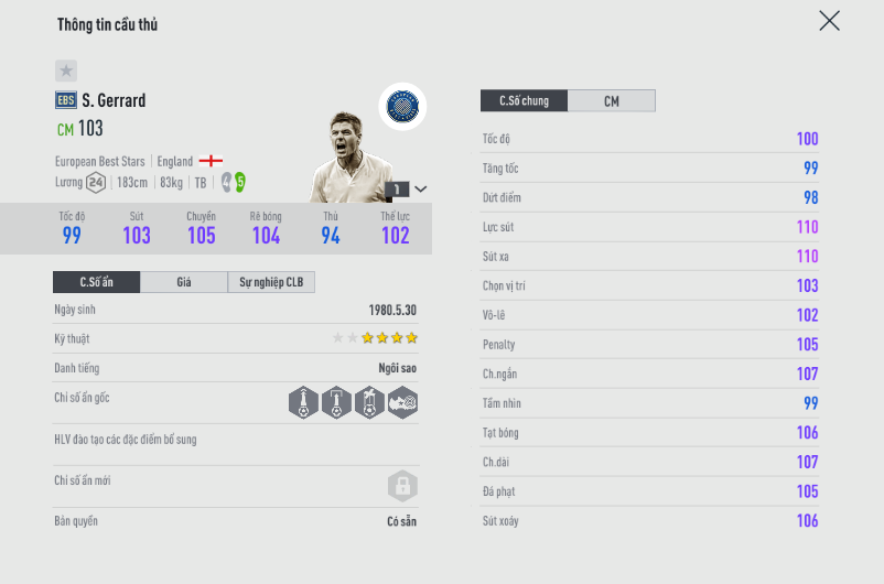 Huyền thoại người Anh có cho mình một mùa giải với mức lương tiệm cận mùa ICON nhưng chỉ số lại kém xa. Dù vậy nhìn vào dàn chỉ số ẩn của Gerrard mới hiểu được tại sao anh lại được nhiều người dùng như vậy, Với khả năng tạo ra đột biến với những cú nã đại bác tầm xa