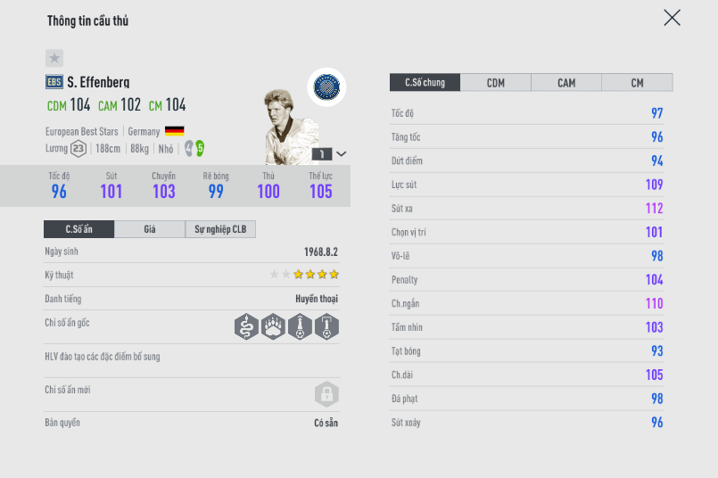 Đây chính là cái tên bất ngờ nhất vì Effenberg đã bị lãng quên trong Fo4. Mùa giải EBS nhường như làm cho anh còn hot hơn cả chính mùa ICON của mình. Cao to, chuyền dài tốt là những đặc điểm nổi bật của tiền vệ có biệt danh Tiger khi còn thi đấu.