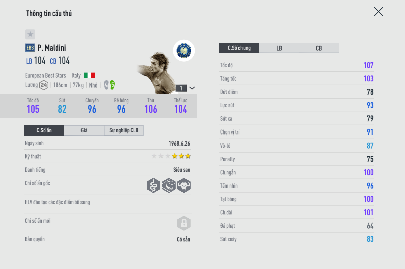 Ngoài mùa giải LH, giờ đây Maldini lại có một thẻ mới ngon hơn, màu thẻ làm chúng ta nhớ đến mùa NHD từng làm mưa làm gió suốt 3 năm qua. Và giờ cũng chính là một Maldini ở LB như vậy, nhưng đá CB max cháy.