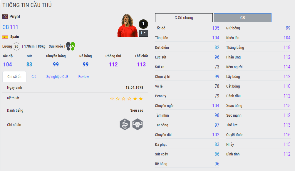 Puyol có thể không cao nhưng anh lại có thể hình đậm người, và đó là lý do để bạn có thể sử dụng anh ấy thoải mái ở gameplay hiện tại. Huyền thoại của Barcelona có được độ nhạy trong các tình huống phòng ngự một cách đáng kinh ngạc. Cho dù tốc độ và sải chân chưa bao giờ là lợi thế của Puyol nhưng tin tôi đi, sẽ rất khó để vượt qua được cầu thủ này.