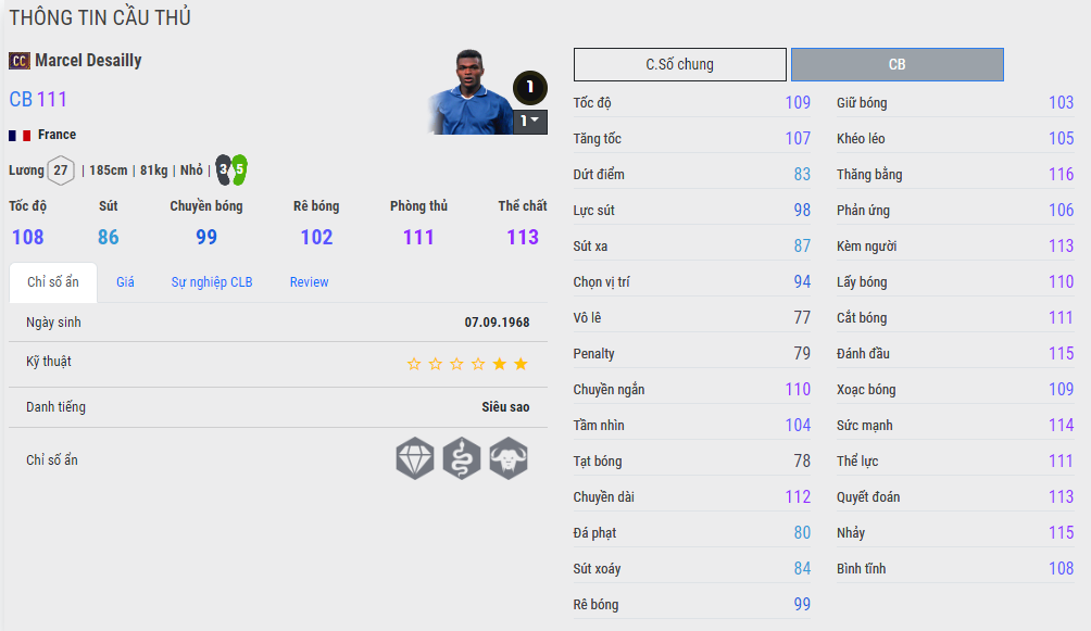 Huyền thoại người Pháp, người đã vô địch World Cup 1998 là người sở hữu lối đá vô cùng máu lửa, không ngại va chạm và là cầu thủ nằm trong đội hình nổi tiếng của Ac Milan những năm 1990 thế kỷ trước. Nếu bạn cần tìm một trung vệ có khả năng cắt bóng tuyệt vời, phong độ ổn định thì rõ ràng đây là cái tên mà bạn khó có thể bỏ qua. Một lợi thế nữa là Marcel Desailly có tới hai team color rất mạnh là Chelsea và Ac Milan.