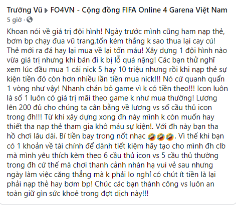 Điều mà bạn Trường Vũ hướng đến là để đỡ phải lo việc thay máu đội hình theo mùa giải, cũng như đỡ tốn kém về tài chính, hãy đầu tư một lần và mãi mãi đó là mua những cầu thủ tốt nhất game hiện tại ở mùa giải ICON, sau đó kết hợp với các cầu thủ khác. Như vậy sẽ có thể đam bảo được sự ổn định trong lâu dài.