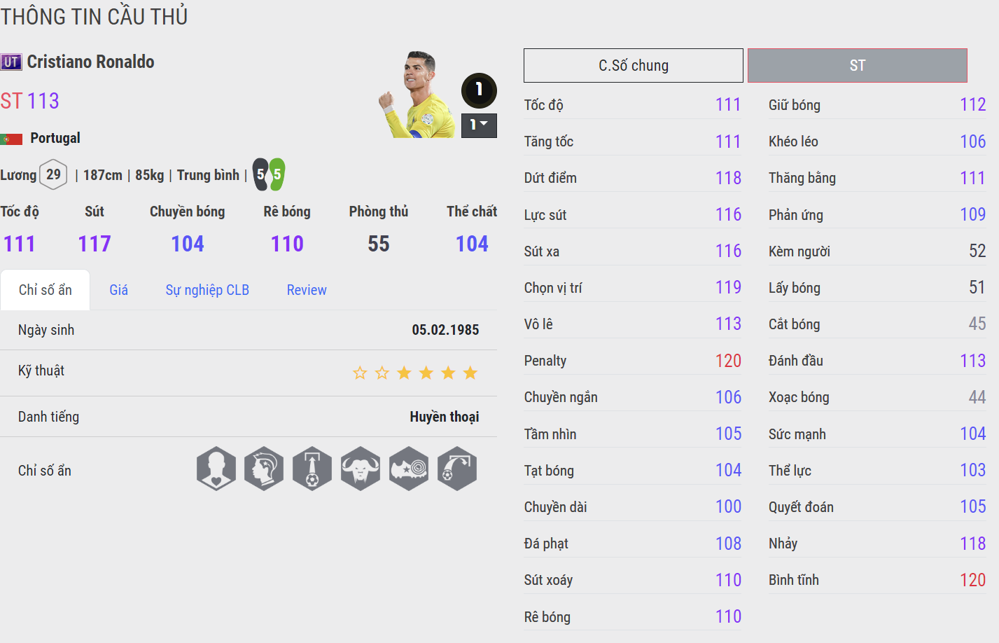 Cristiano Ronaldo được đánh giá là một trong những tiền đạo toàn diện bậc nhất FC Online khi anh mang đến sự hiệu quả từ khả năng dứt điểm, sút xa, tranh chấp không chiến đều rất nổi bật.