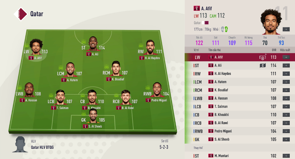Các cầu thủ trong game của Qatar chỉ dừng lại ở thẻ 22live vì vậy chất lượng đội hình này trong game khá là kém. Tuy nhiên đây chính là lứa cầu thủ U23 từng chạm trán với đội tuyển Việt Nam trước đây, họ trình diễn một lối đá khá hay. Dẫu biết cơ hội đi tiếp cho Qatar là không nhiều khi họ ở trung bảng với Senegal, Hà Lan và Ecuador. Tuy nhiên biết đâu một phép màu chủ nhà sẽ giúp họ có được tấm vé thứ 2 sau Hà Lan.