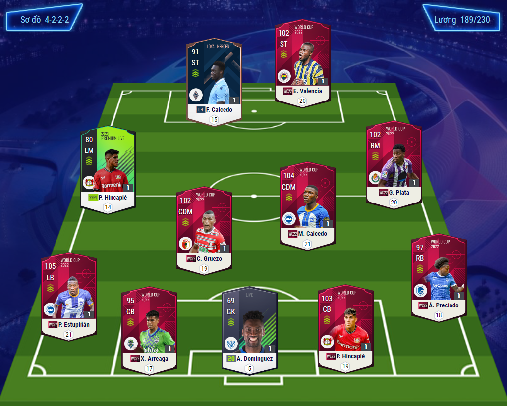 Ở ngoài đời thì Ecuador đoạt vé chính thức thứ 4 để đến Qatar cùng với 3 ông lớn trong khu vực. Họ là đối thủ tương đối khó chịu với nhiều đội bóng. Khi lối đá tập thể luôn được đề cao, đây là đội bóng có khả năng trở thành ngựa ô của giải đấu khá cao. Nhìn vào đội hình trong game các bạn cũng có thể thấy họ có tới 8/11 vị trí đều có thẻ WC22, không hề đơn giản chút nào.
