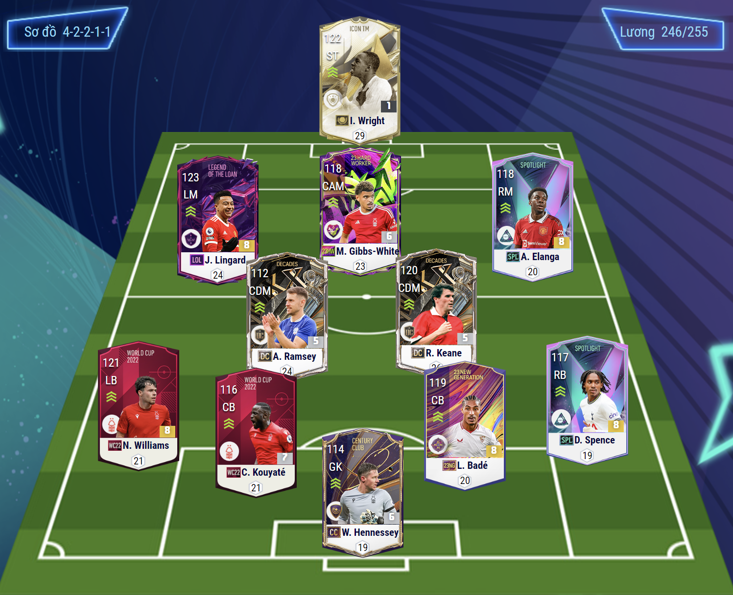 Sơ đồ 4-2-2-1-1 với đầu tàu là Ian Wright vốn được xem là một trong những tiền đạo cực kì hiệu quả. Bên dưới là sự hỗ trợ của các đồng đội trong đó nổi bật có thể kể đến là Lingard với phong cách thi đấu khá toàn diện. Ngoài ra những vị trí còn lại được lựa chọn và sắp xếp như hình để tối ưu đội hình thi đấu.