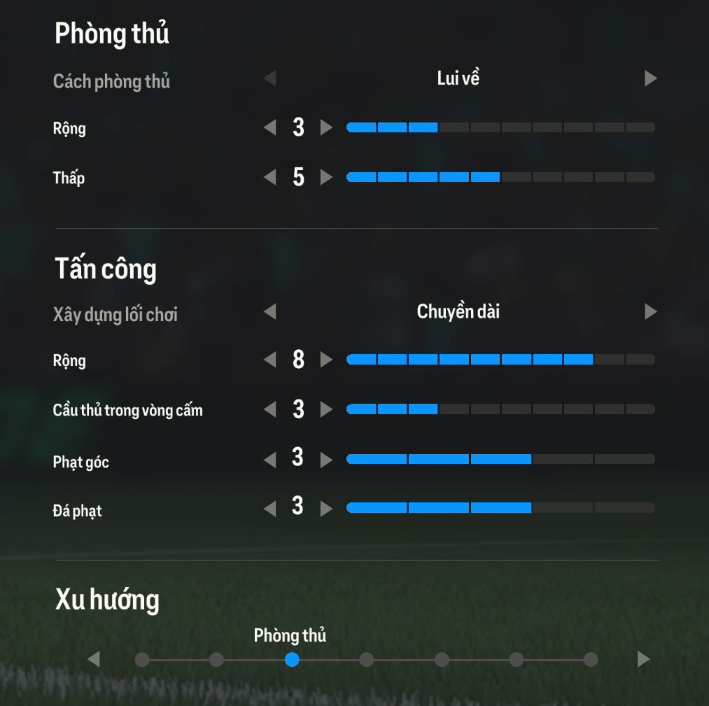 Chiến thuật phòng ngự cân bằng với Rộng 3 - Thấp 5. Đây là dạng thiết lập để các cầu thủ bo sát vào phạm vi trung lộ khi tham gia phòng ngự để hạn chế các tình huống chọc khe, sút xa hoặc ZD ngoài vòng cấm, Độ thấp ở mức trung bình sẽ giúp các cầu thủ không lùi quá sâu thay vào đó là chủ động phòng ngự khu vực
