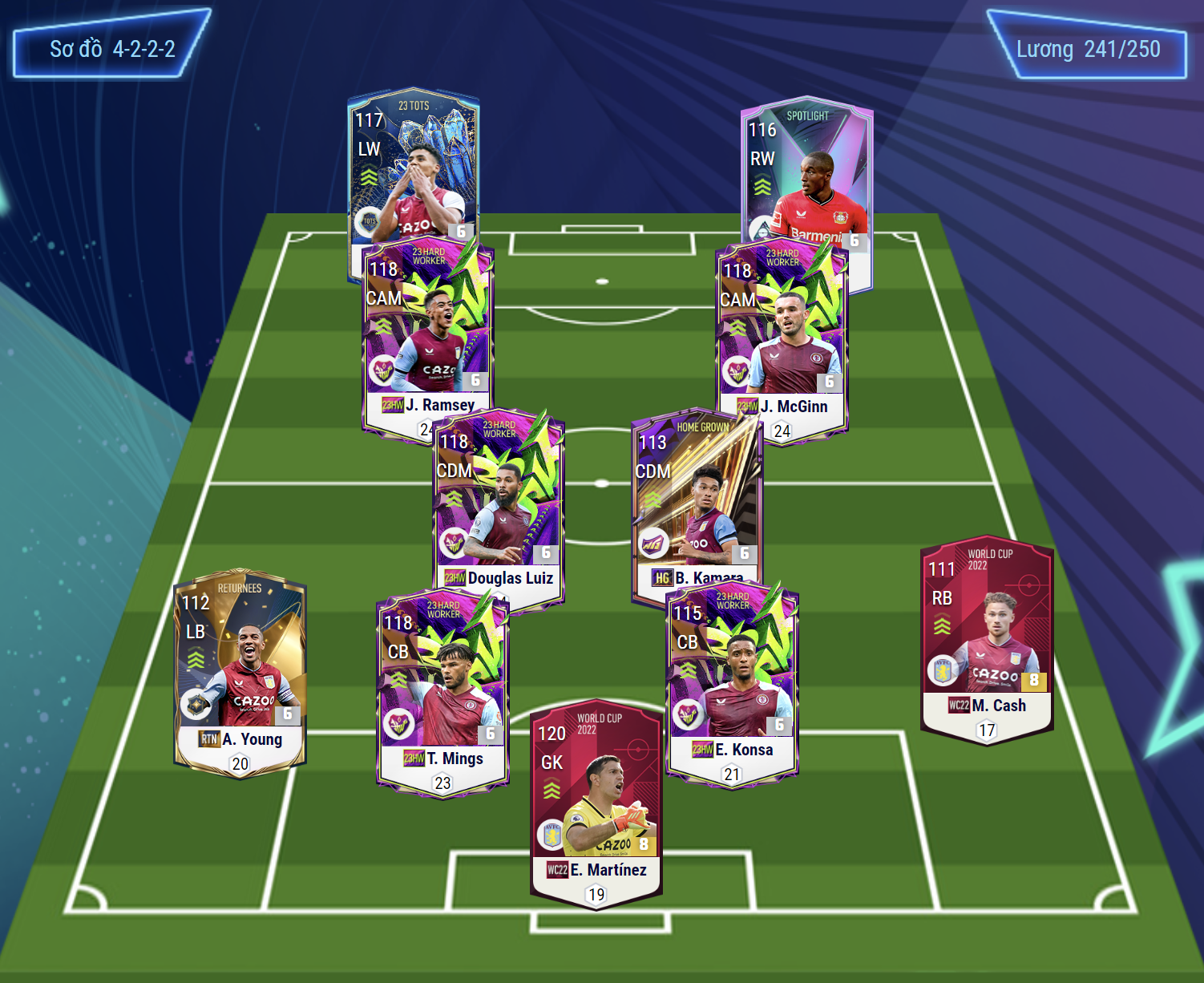 Sơ đồ chiến thuật 4-2-2-2 của Aston Villa được triển khai với phong cách thi đấu mới lạ, khác biệt so với những sơ đồ truyền thống khi 2 vị trí tiền đạo cắm được kéo dạt thành RW, LW. Với cách kéo giãn này, sơ đồ của Aston Villa sẽ nới rộng hơn ra khoảng không ngoài biên, kéo 2 tiền vệ trung tâm dâng sâu vào giữa và tạo nên một thế trận tấn công linh hoạt.