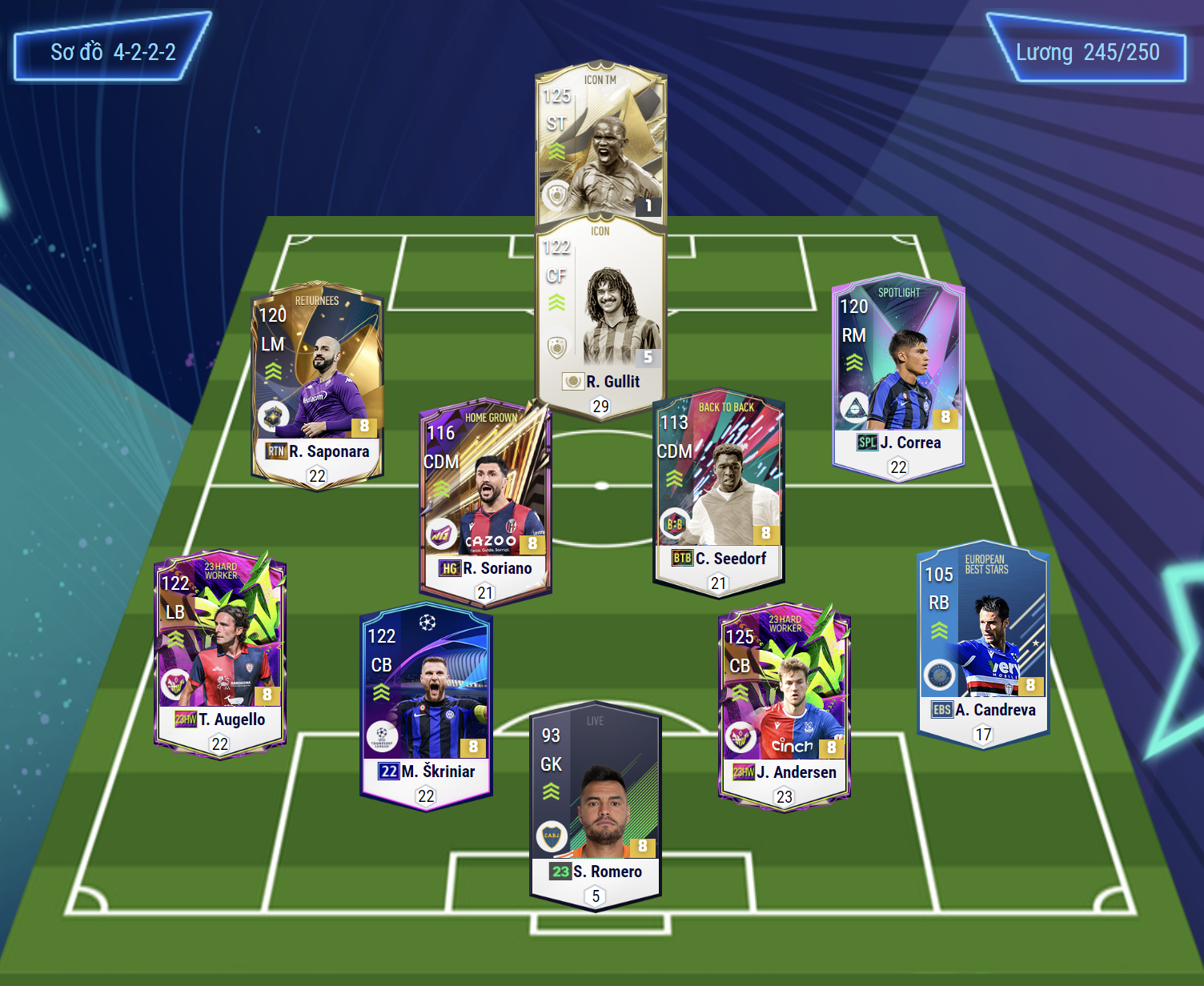 Cặp đôi tiền vệ trung tâm chính là Seedorf và Soriano, 2 tiền vệ trung tâm phù hợp với tiêu chí hiện tại đó là vừa kỹ năng chuyền bóng tốt, vừa có khả năng sút xa cực kì uy tín. Bộ tứ vệ bao gồm Augello và Candreva ở 2 hành lang cánh và cặp đôi trung vệ sẽ là Skriniar và Andersen. Thủ môn được tin dùng chính là Romero, cựu thủ môn của MU.