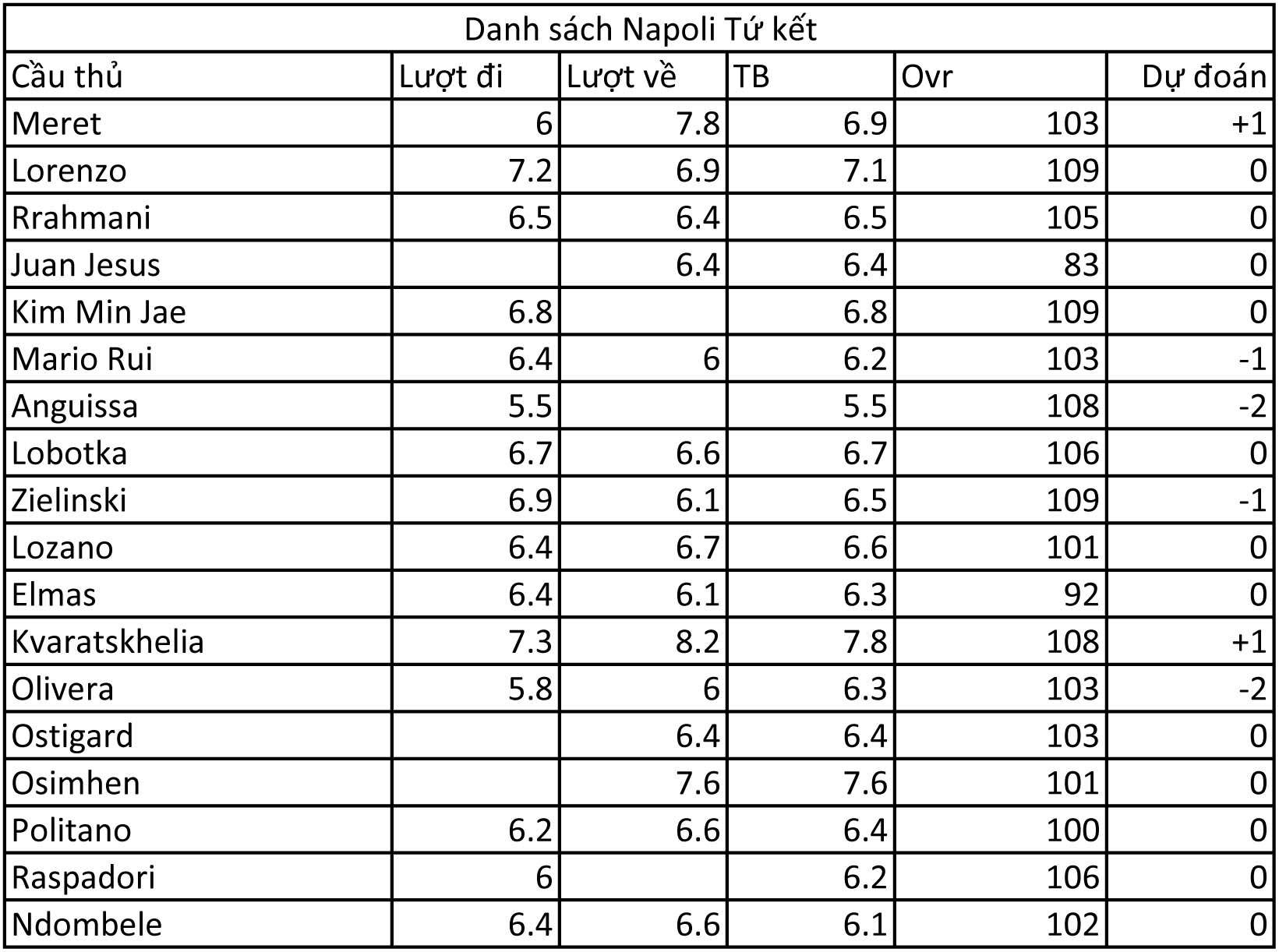 Trên hình chính là những dự đoán của chúng tôi về khả năng tăng giảm chỉ số sắp tới của team Napoli. Có thể thấy là trừ trường hợp của Anguissa bị thẻ đỏ thì các vị trí khác đều chơi không tệ cho lắm. Nhưng hàng thủ của Napoli lại là những người gặp sai lầm khi để cho Ac Milan tận dụng được.