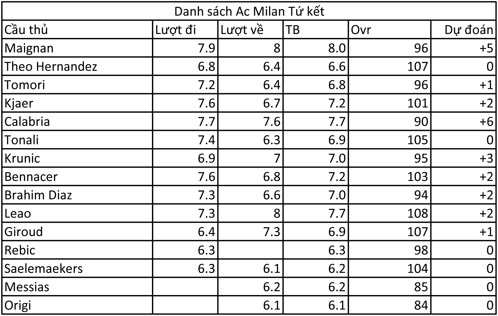 Ac Milan là người chiến thắng và đi tiếp, rõ ràng họ đã chọn một đấu pháp thích hợp, và những con người của họ cũng đã chơi rất tuyệt vời. Giờ đây dàn cầu thủ của Ac Milan sẽ được tăng chỉ số khá nhiều. Bởi xuất phát điểm của họ đều khá thấp, chỉ có vài trường hợp là có ovr cao ngay từ đầu mà thôi.