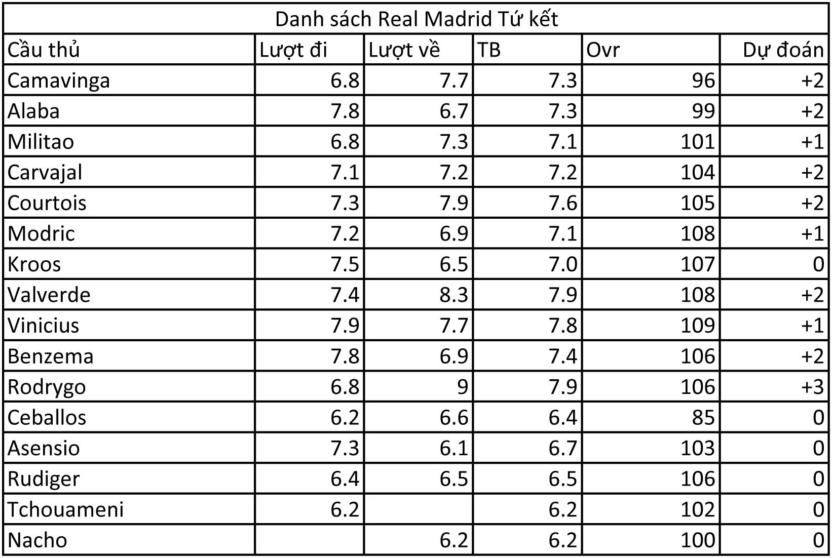 Benzema nhiều khả năng sẽ không tăng, nếu có chỉ được 1 điểm do lượt đi anh có ghi một bàn những lượt về lại bị chấm điểm khá thấp. Tương tự một con hàng quốc dân khác là Rudiger cũng sẽ không được tăng chỉ số vì không có sự gia tâng đột biến về phong độ.