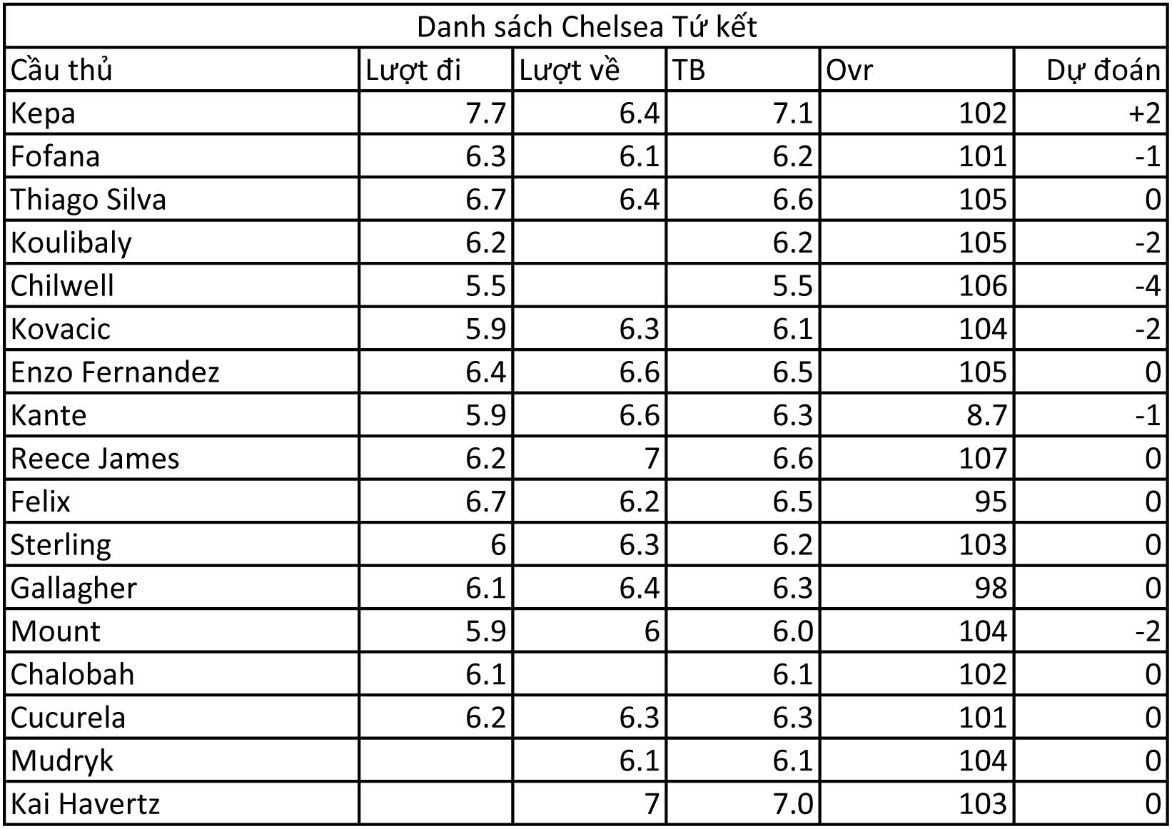 Cầu thủ duy nhất chơi ổn định của Chelsea ở tuyến giữa là Enzo Fernandez nhiều khả năng sẽ đươc giữ nguyên chỉ số. Trong khi đó Kante với ovr 87 không biết nên cười hay nên khóc nếu tiếp tục bị giảm. Các cầu thủ ở hàng thủ có lẽ chỉ Reece James và Thiago Silva là giữ được chỉ số mà thôi