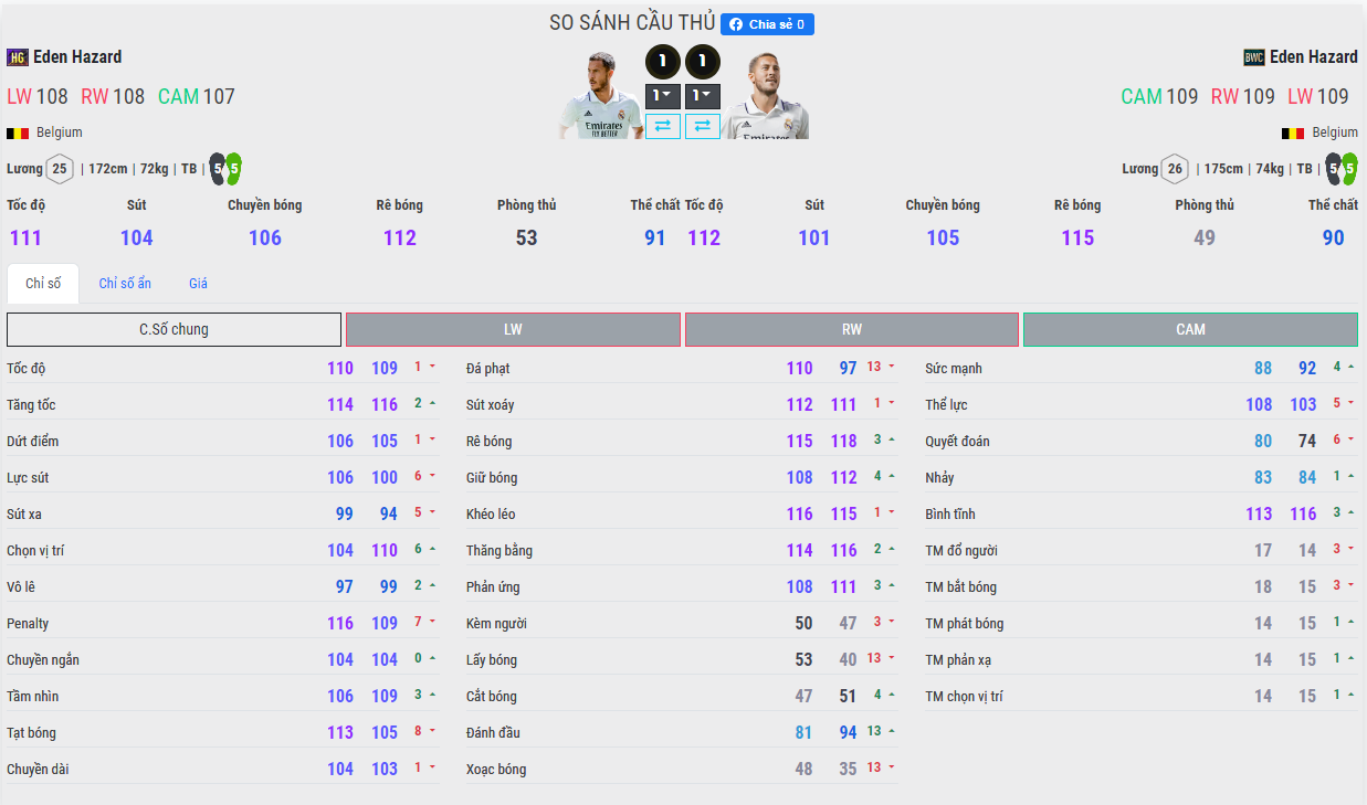 Nếu bạn thích một Eden Hazard đi bóng mạnh mẽ, chống chịu va chạm tốt thì có lẽ bạn nên lựa chọn Eden Hazard BWC ( chấp nhận mức lương cao nhất 26 ) vì mùa này có cân nặng, chiều cao ổn nhất. Dáng người của Eden Hazard BWC nhìn khá đầm nhưng không quá nặng nề mà gây ảnh hưởng đến tăng tốc của cựu cầu thủ Chelsea.
