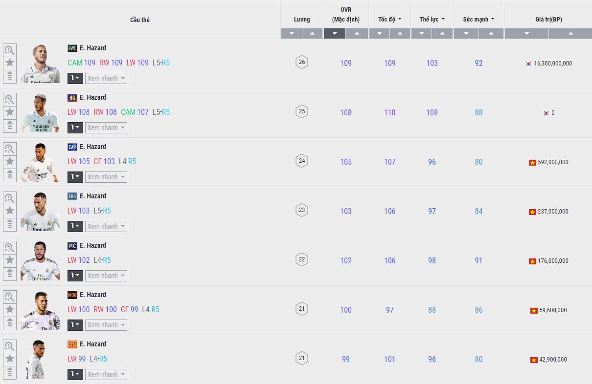 Có khá nhiều mùa giải của Eden Hazard hữu dụng trong FC Online, nhưng nổi bật nhất vẫn là HG ( Home Grown ) và BWC. Tuy nhiên, mùa giải BWC đã vào danh sách giới hạn sau khi FIFA Online 4 đổi tên thành FC Online, nên việc tìm kiếm cũng như sở hữu được mùa giải này là tương đối khó khăn.
