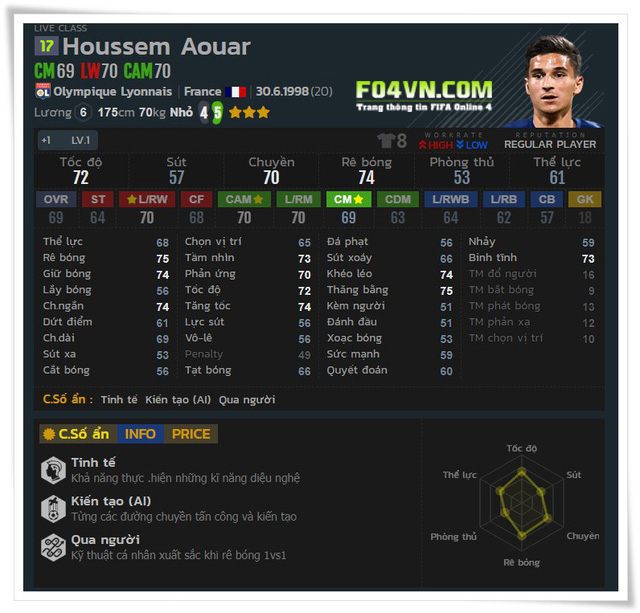 Tương lai gần, tốc độ phát triển chỉ số của Houssen Aouar trong FO4 ở mức tương đối. Nếu có thể, bạn hãy nâng cấp thẻ cộng (+) 5, qua đó để trải nghiệm tối ưu các kỹ năng, khả năng để bù trừ các điểm hạn chế từ cầu thủ trẻ người Pháp.