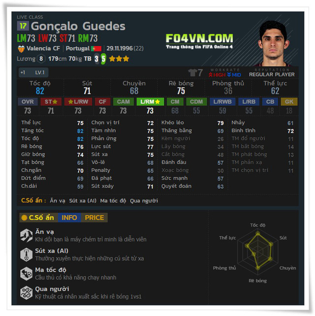Trong FO4, Goncalo Guedes (17) thuộc mẫu cầu thủ ăn vạ. Đây là điểm mạnh với những tiền vệ có xu hướng hộ công hoặc dạt cánh. Bên cạnh đó, khả năng bức tốc là điểm mạnh của Guedes khi chơi vị trí cánh - được bổ trợ các chỉ số ẩn như ma tốc độ.