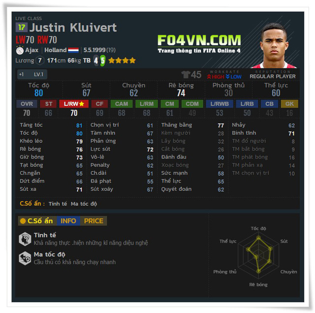 Trong FO4, điểm mạnh của Justin Kluivert (17) nằm ở kỹ năng xử lý bóng tinh tế, lắt léo. Bên cạnh đó, khả năng bức tốc là điểm cần khai thác ở cầu thủ này. Nếu cần một cái tên có tốc độ tốt để kết thúc những đợt phản công nhanh, Justin là cái tên cho bạn.
