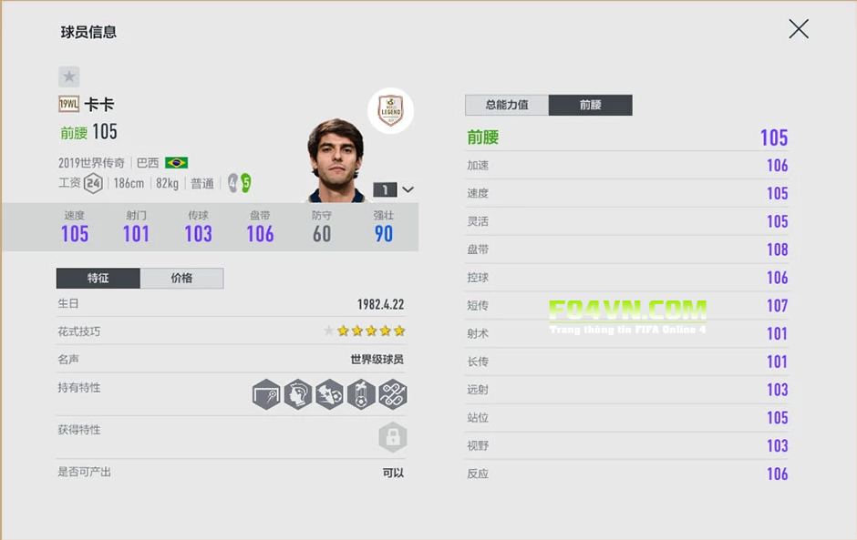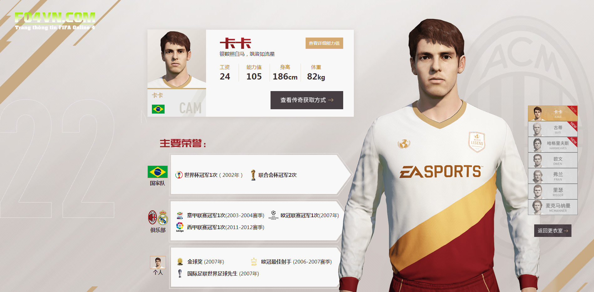 Một trong những cầu thủ có lượng fan nam cũng như fan nữ vô cùng đông đảo. Thiên thần Kaka chính là cái tên đầu tiên trong danh sách 3 cầu thủ được thêm vào World Legend trong bản cập nhật này. Lối chơi hoa mỹ, kỹ thuật nhưng không kém phần hiệu quả. Hi vọng sắp tới anh sẽ cập bến Server Việt Nam để người chơi FO4 có cơ hội đưa anh về đội để trải nghiệm.