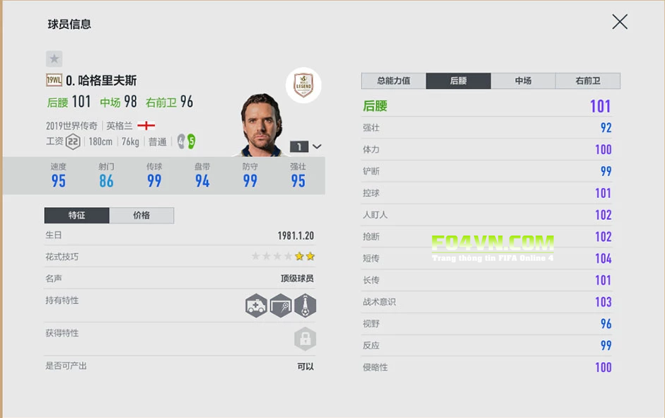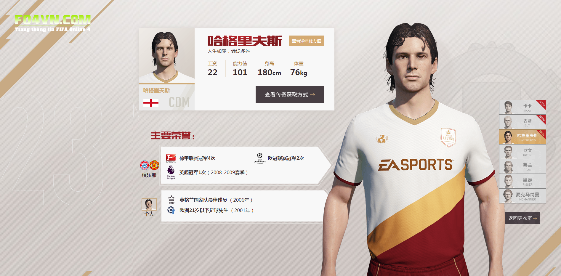Chỉ số của Hargreaves không quá nổi bật nhưng cũng là rất tốt. Chiều cao 1m80, nặng 76kg và có thể hình trung bình. Anh hứa hẹn sẽ là một nhân tố phòng ngự xuất sắc thời gian sắp tới khi anh có mặt trong FIFA Online 4.