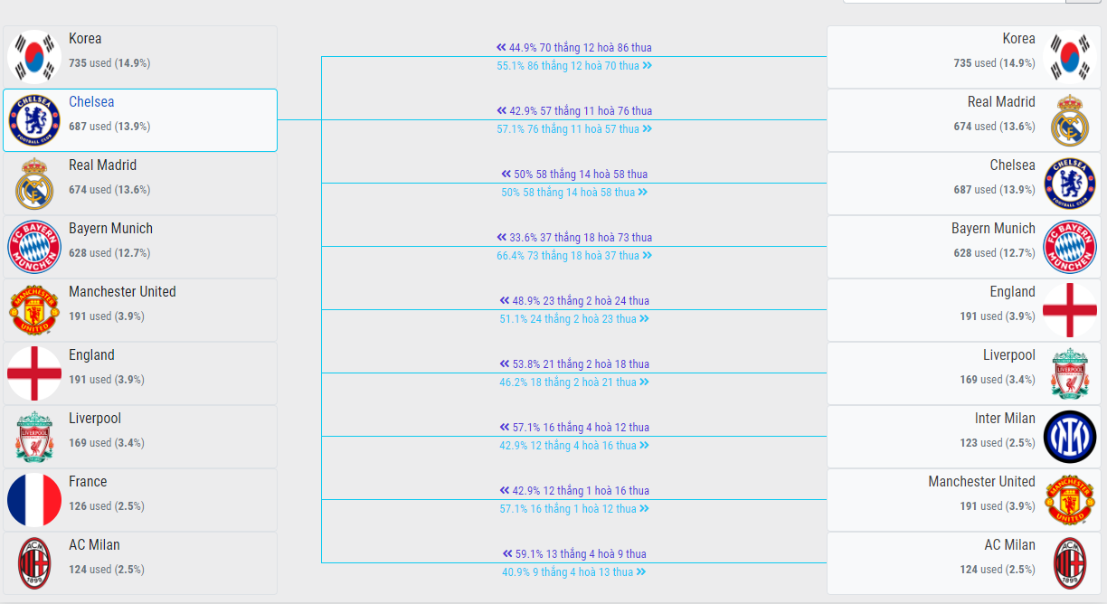 Ví dụ trên hình là team Chelsea có tỷ lệ chiến thắng lên tới 57% khi đối đầu với team Real Madrid vào ngày hôm nay, với 76 trận thắng, 11 hòa và 57 trận thua. Tất nhiên những con số ở trên chỉ mang tính tham khảo được lấy từ Data Center của máy chủ Hàn, còn tùy thuộc vào sơ đồ, chiến thuật cũng như nhân sự của mỗi team nữa. Nên bạn chỉ nên coi nó có tính chất tương đối thôi.