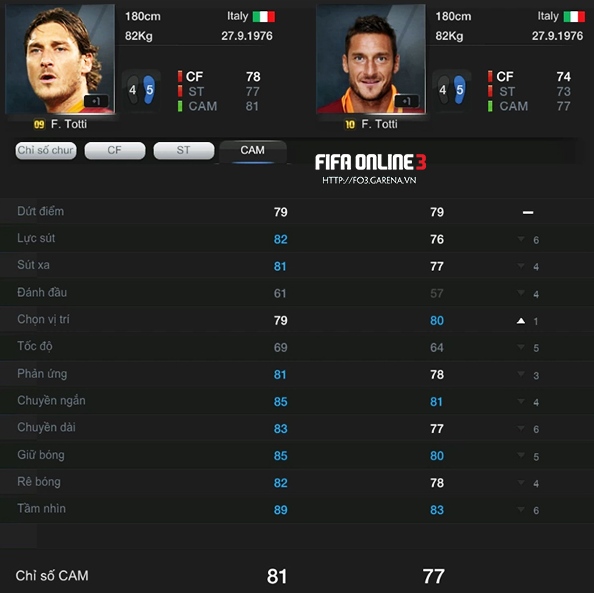 Trong quá khứ ở FIFA Online 4 thì Totti có khá nhiều thẻ mùa giải, nổi tiếng nhất là mùa 06, được đánh giá là best CAM một thời. Trong khi đó Platini thì không xuất hiện tại FO3.