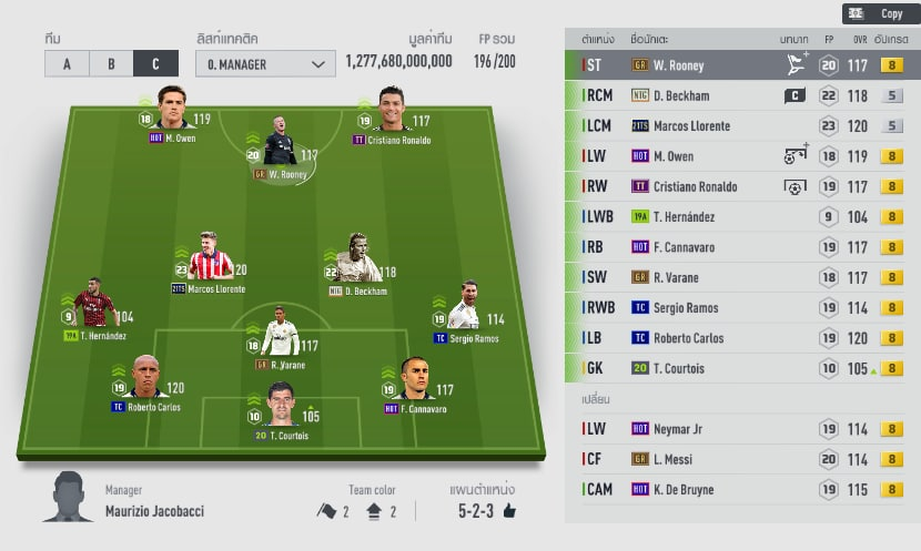 Trong đội hình này thì ngoài cái tên Rooney ra, 10 cầu thủ còn lại đều đã từng khoác áo Real nên chúng ta có thể coi đây là một team color Real. Nếu thích các bạn có thể thay vị trí của Rooney bằng cái tên Benzema hoặc Ronaldo " béo"