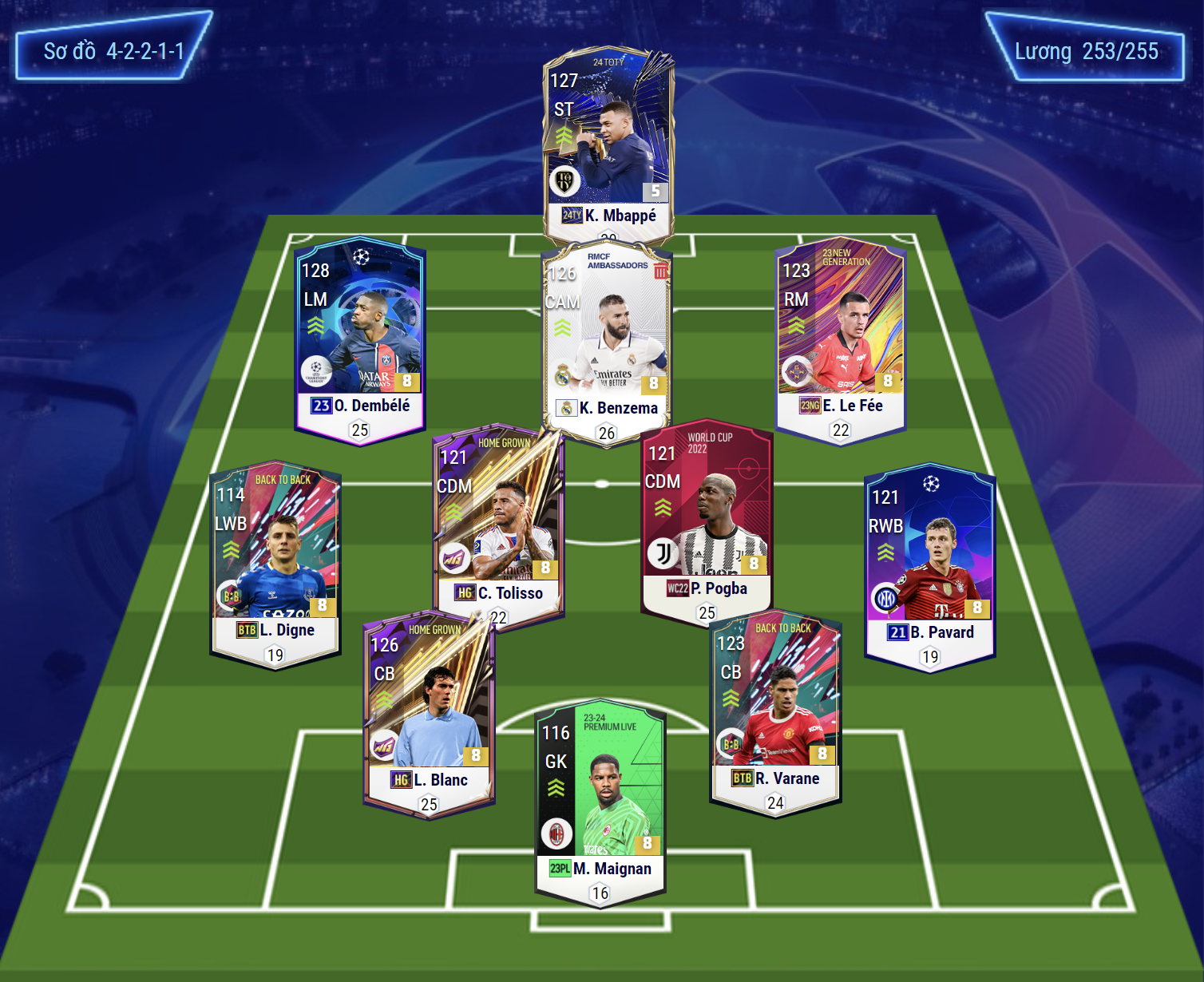 Khác với những sơ đồ tập trung nhiều cầu thủ ở trung lộ tạo nên chiến thuật cây thông quen thuộc, chiến thuật này được thiết lập cực kì cơ bản với sơ đồ 42211 đơn thuần. Vị trí tiền đạo cắm được lựa chọn là Mbappe. Hỗ trợ chính cho vị trí tiền đạo là tiền vệ công Benzema. Cặp cánh được tin dùng là Dembele và Le Fee.