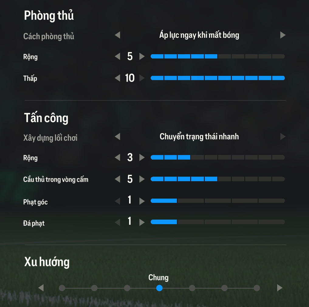 Chiến thuật đơn được thiết lập như hình nhằm tối ưu lối chơi và khả năng di chuyển thi đấu của các cầu thủ.