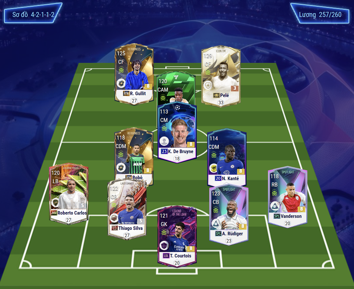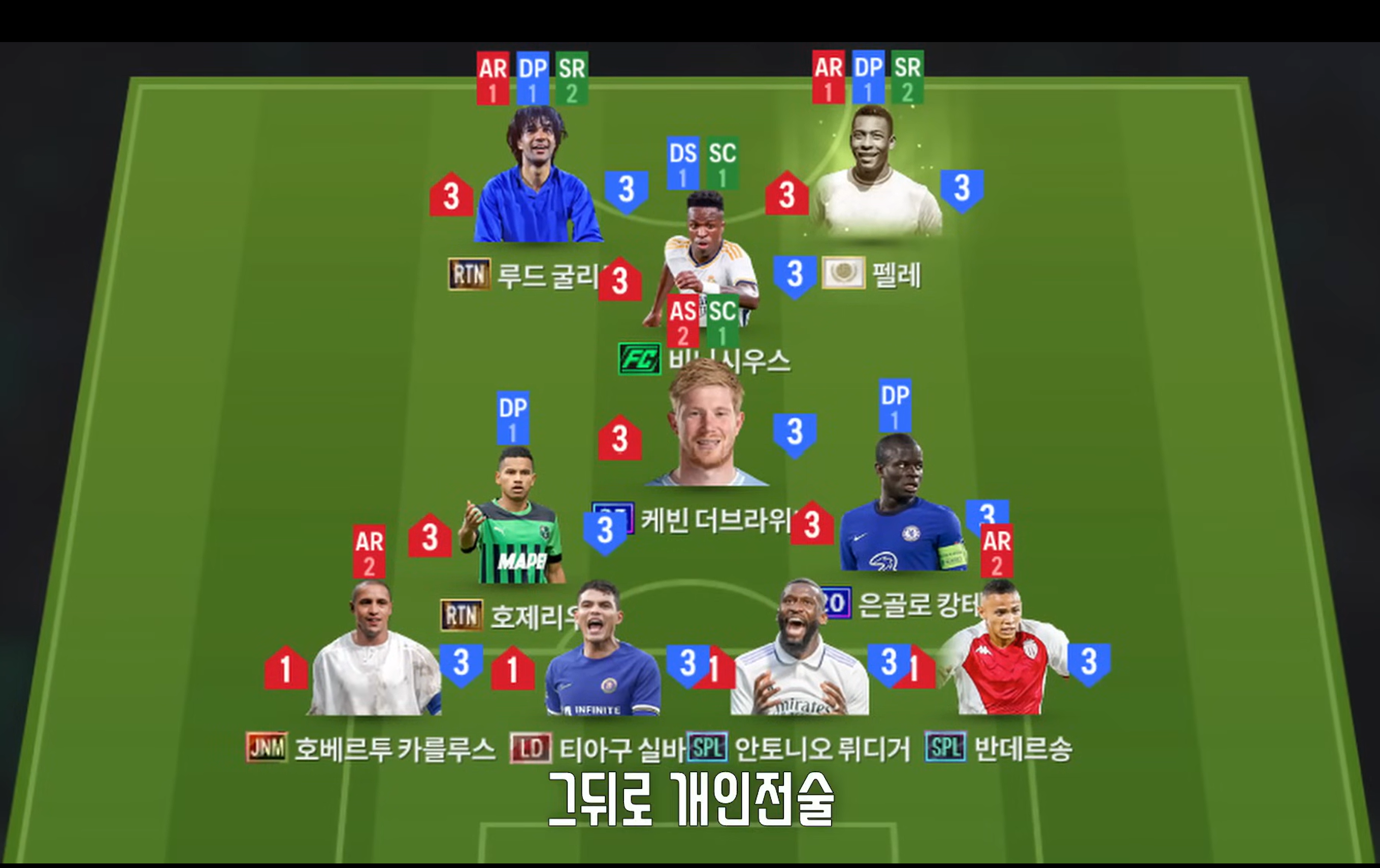 Sơ đồ được lựa chọn là sơ đồ 42112 với vị trí tiền đạo được lựa chọn là Gullit và Pele. Hỗ trợ cho cặp đôi này là Vinicius ở vai trò CAM. Ở vị trí tiền vệ trung tâm, De Bruyne đảm nhiệm nhiệm vụ quan trọng là chia bài và kết nối giữa các tuyến.