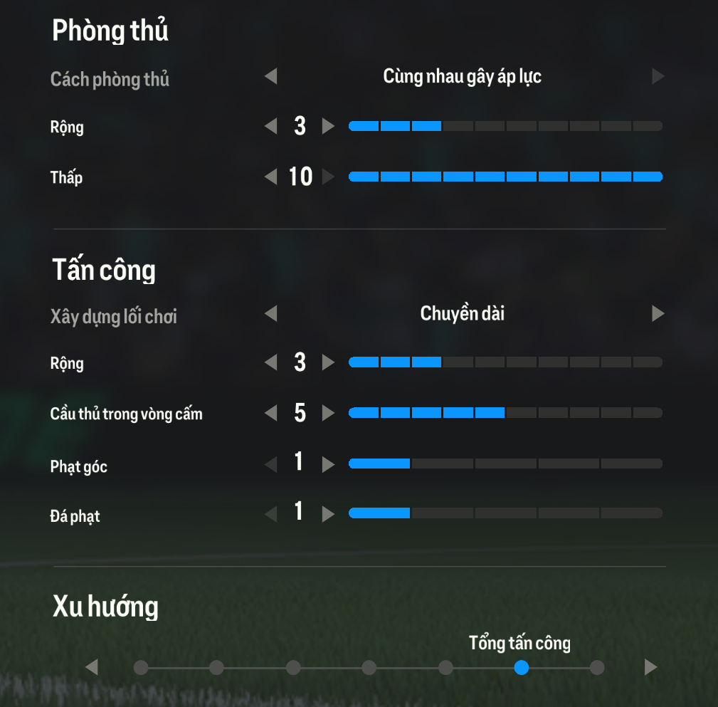 Với chiến thuật đội, lối chơi Áp lực được lựa chọn để các cầu thủ chủ động pressing từ sớm để áp đảo đối phương cũng như đánh chặn các đợt tấn công từ sân đối thủ để hạn chế đối phương áp sát khung thành. Rộng 3 và thấp 10 để đẩy cao đội hình phòng ngự và pressing hiệu quả.