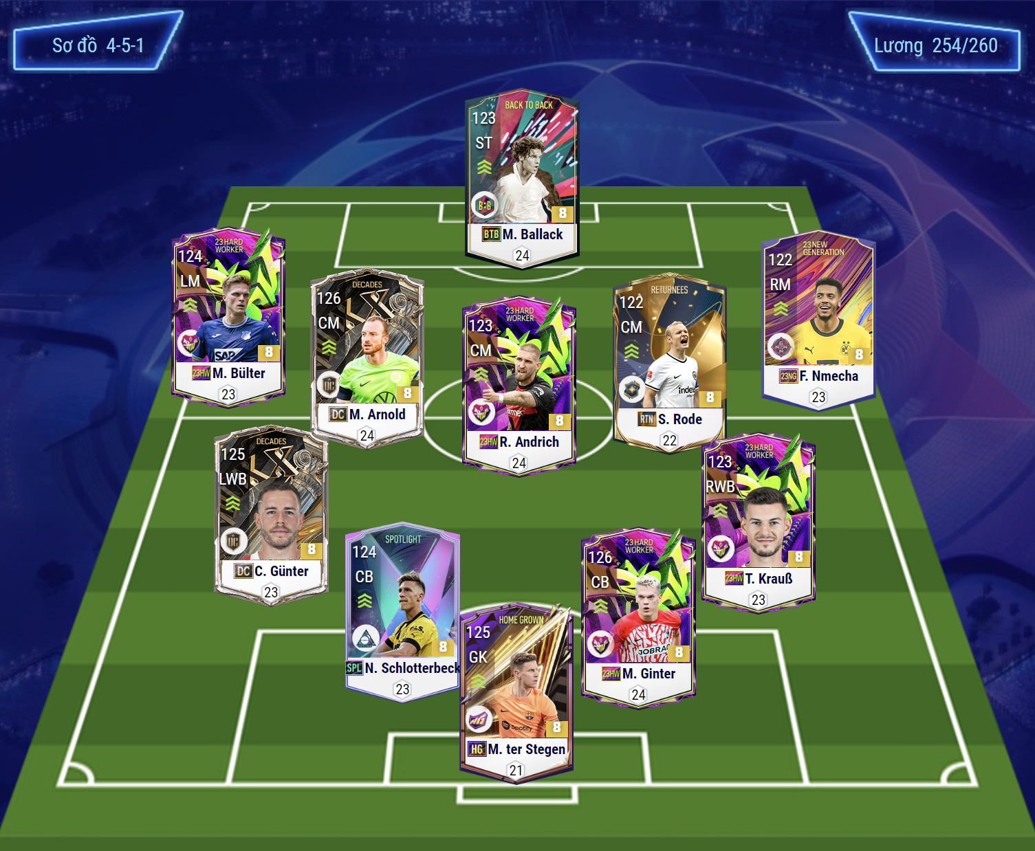 Sơ đồ 451 được lựa chọn khá cơ bản với team color Đức, vị trí tiền đạo là Ballack. Cặp đôi tiền vệ cánh được lựa chọn là Bulter ở hành lang trái và Nmecha ở vị trí cánh phải. Bộ 3 tiền vệ trung tâm được lựa chọn lần lượt là Arnold, Andrich, Rode.