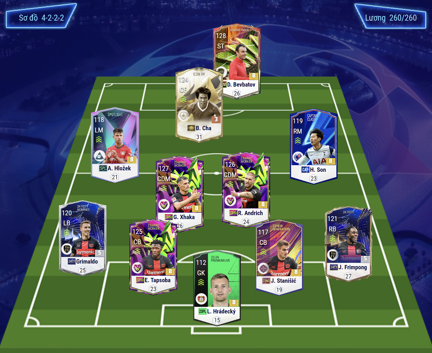 Sơ đồ 4222 ST/CF với Bevbatov là cái tên chơi cao nhất trên hàng công. Vị trí hộ công Cha Bum Kun là cái tên cực kì hiệu quả. Cặp đôi tiền vệ cánh là Hlozek và Son Heung Min được đánh giá cực kì cao về chất lượng.