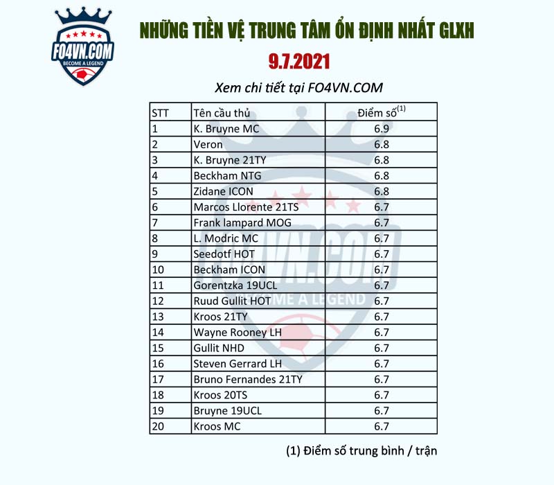 Tiếp theo seri thống kê của GLXH sau bản update 6.0 Chúng ta sẽ đến với vị trí tiền vệ trung tâm với những cái tên ổn định nhất. Với tiêu chí điểm trung bình cao nhất trên tổng số trận. Và thống kê lấy trong top 1000 ranking GLXH
