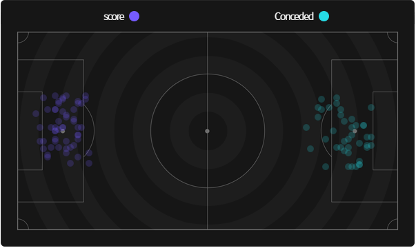 Biểu đồ vị trí ghi bàn ( màu tím ) và thủng lưới ( màu xanh )