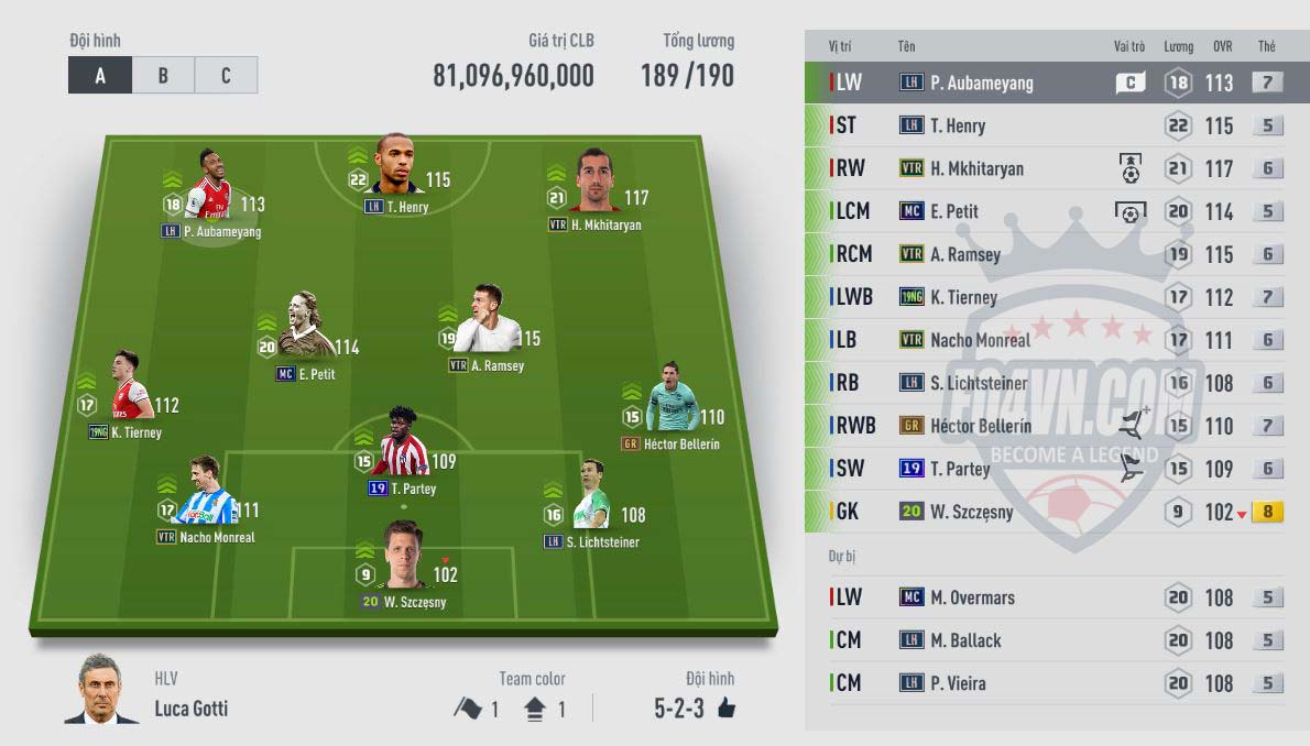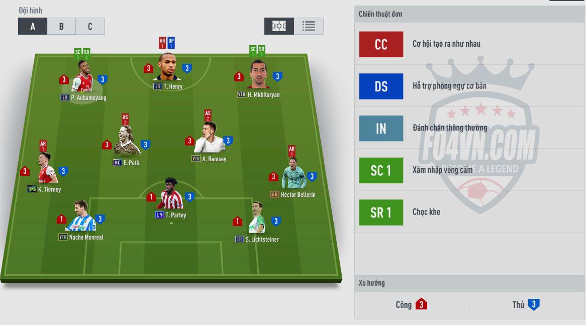 Arsenal là câu lạc bộ có nhiều fan hâm mộ tại Việt Nam. Đa phần là thời hoàng kim của CLB này đầu thế kỷ 21. Với những huyền thoại trong đội hình thời điểm đó. Ars là một trong những CLB có lượng cầu thủ chất lượng bậc nhất trong game. Thậm chí còn hơn cả những MU hay Barca. Fan Ars thường thích lối đá nhanh, ban bật tốc độ cao và đẹp mắt. Tuy nhiên trong game thì không phải lúc nào cũng muốn là được khi còn nhiều yếu tố tác động lên cầu thủ của bạn. Hôm nay Fo4vn xin được gửi tới các bạn đội hình và sơ đồ của một fan Ars leo rank thách đấu.