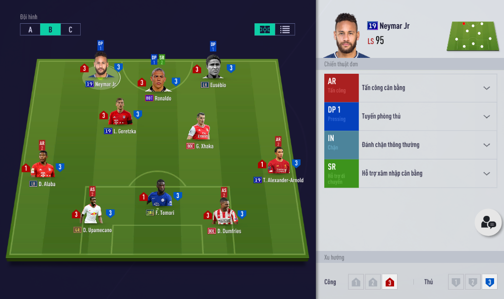 Sơ đồ ra quân với 3 hậu vệ đều có thiên hướng tấn công tốt, một yếu tố rất quan trọng trong chế độ glxh. Điểm chung của 3 CB là đều có tốc độ rất tốt, giúp tăng khả năng đeo bám khi bám theo tiền đạo đội bạn