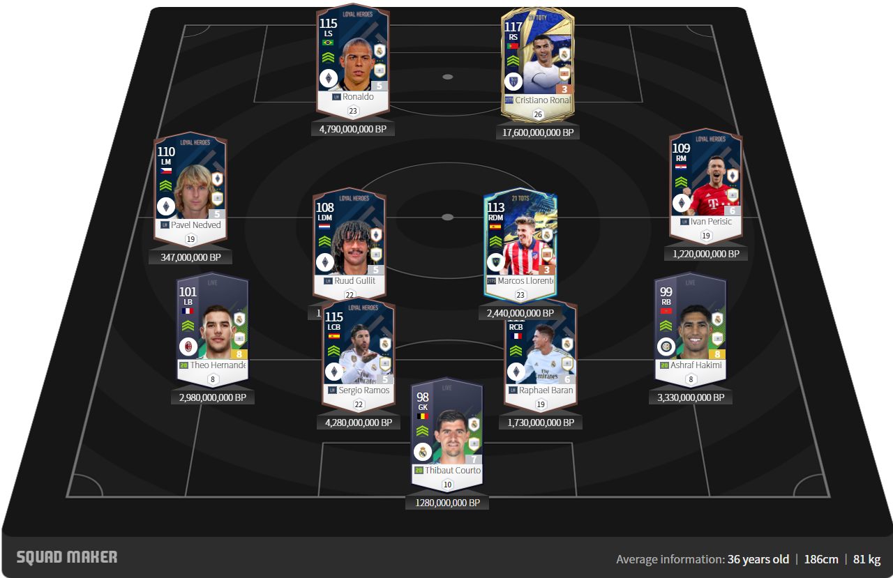 Với lòng cốt là các cầu thủ Real tuy nhiên có pha chút những nhân tố bên ngoài như Saul, Nedved và Perisic. Đây cũng là một cách build khá thông dụng hiện nay khi một số team color thiếu đi một vài vị trí chủ lực.