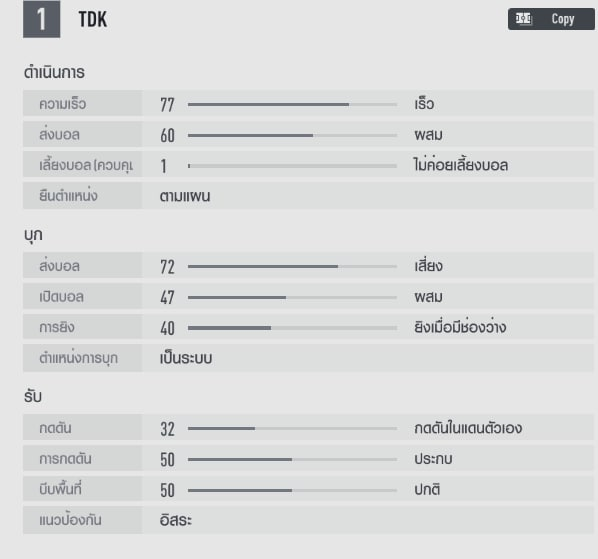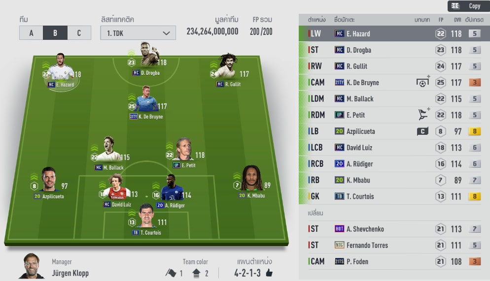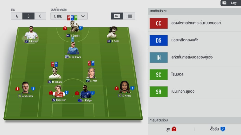 Một cách xây dựng khá dị của HLV Thái Lan khi đưa Gullit lên đá RW trong khi đó Bruyne được kéo vào giữa đá CAM. Bên cạnh đó cặp đội trung vệ của team này sử dụng Luiz và Rudiger. Tất nhiên bạn hoàn toàn có thể biến tấu