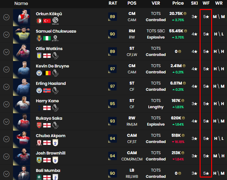 Hiện không rõ EA có thống kê cả tỷ lệ chuyền bóng bằng cả hai chân hay không ? hay chỉ dựa trên số bàn thắng. Dưới đây là danh sách một vài cầu thủ khác cũng có hai chân 5/5 ở mùa giải 23TS bên FIFA 23