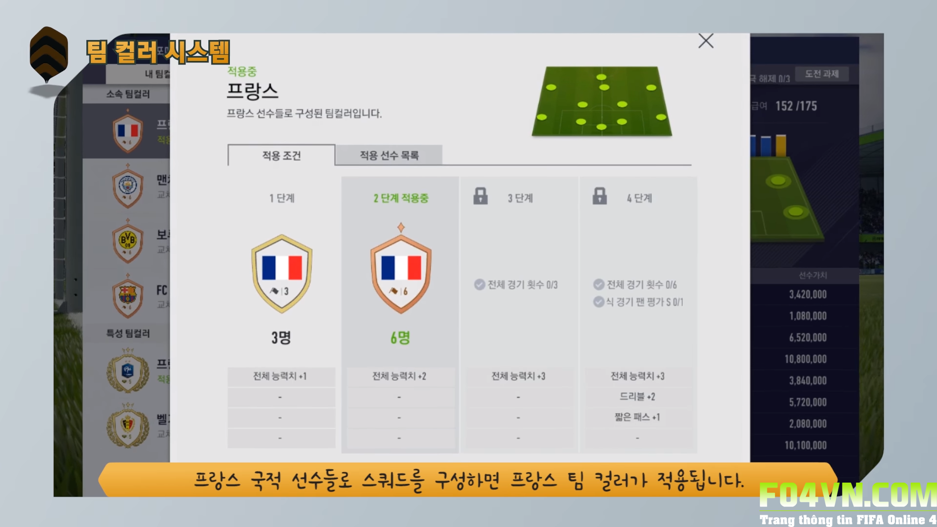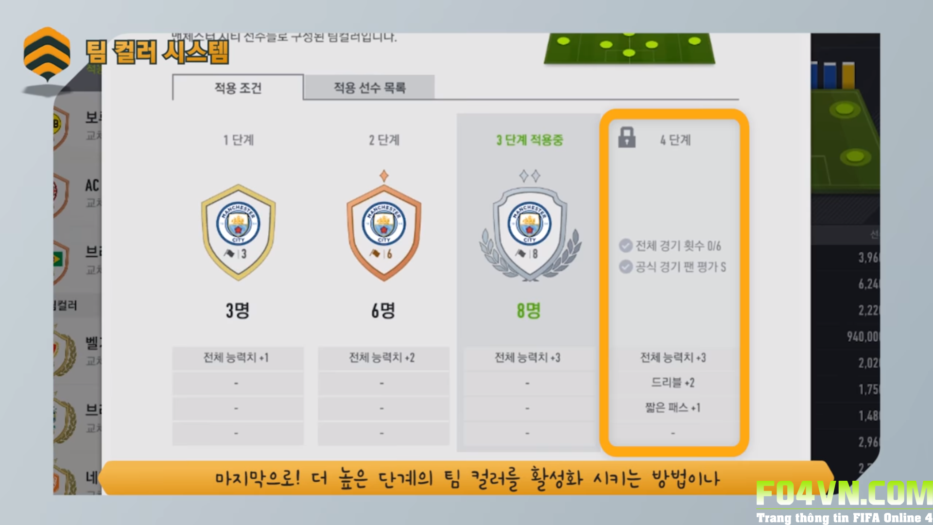 Level 4: Cần 11 cầu thủ có cùng CLB (hoặc quốc tịch), đá 6 trận và 1 trận đạt đánh giá hạng S, level này được +3 OVR và 1 vài chỉ số con