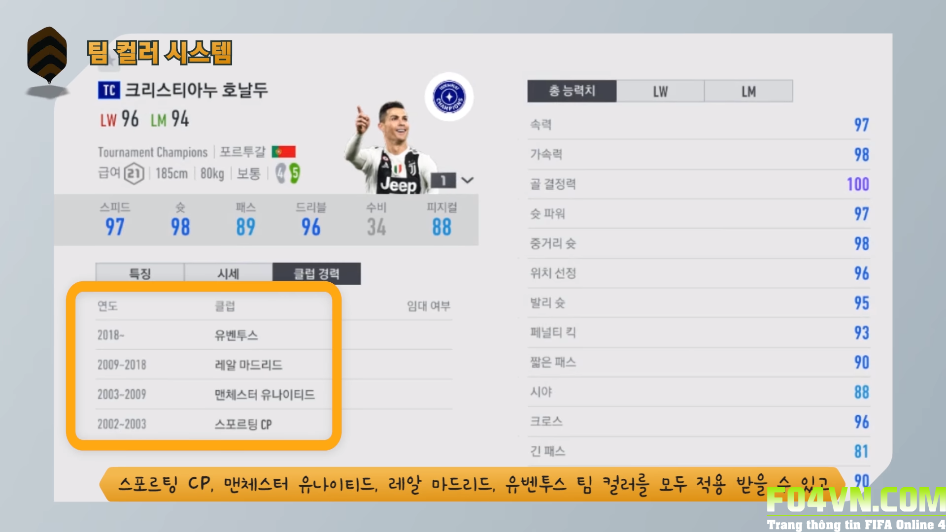 Các cầu thủ trong FIFA Online 4 sẽ có thêm một bảng phụ hiển thị những CLB mà họ đã từng thi đấu trong suốt sự nghiệp. Điều này dễ dàng giúp người chơi hiểu hơn về cầu thủ của mình và dễ dàng dây dựng đội hình.