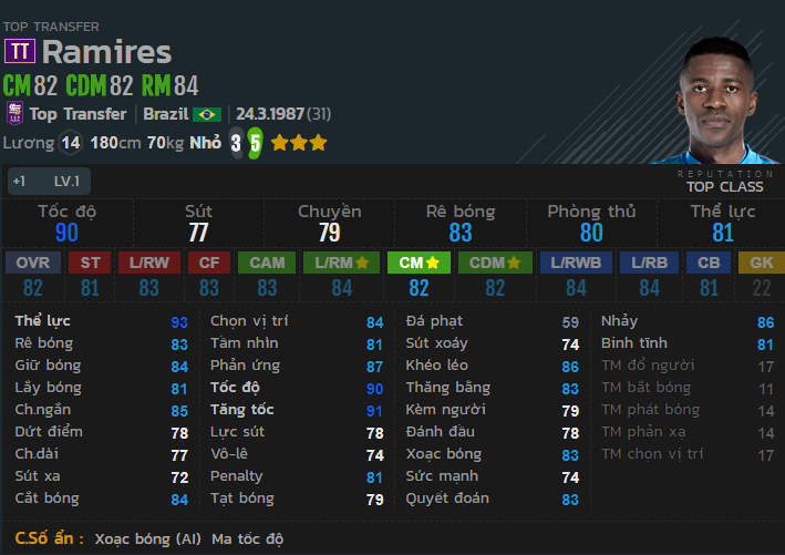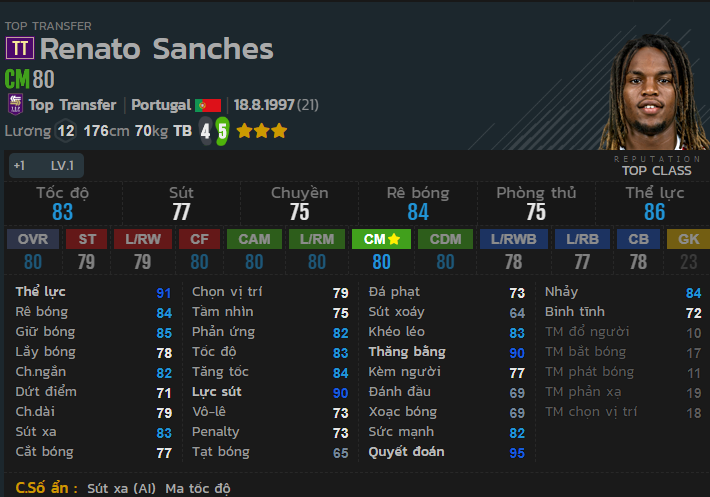 Mùa TT của tài năng trẻ người bồ có bộ chỉ số khá cao ở mức 80, không quá trội so với những cầu thủ top nhưng cực kì hay khi được đem so sánh mặt bằng với các cầu thủ tầm trung có cùng mức chỉ số hoặc nhỉnh hơn một chút. Với thể chất cực kì mạnh mẽ của mình Renato Sanches TT có thể chơi tốt ở cả vị trí CM lẫn CDM. Tốc độ tốt, nhanh nhẹn và thăng bằng tốt và khả năng di chuyển vô cùng ổn định chính là những phẩm chất đang được quan tâm của cầu thủ này. Nếu bạn là người quan tâm mẫu cầu thủ box-to-box tốc độ, giỏi tranh chấp và sút xa tốt. Hãy nghĩ tới và trải nghiệm thử mẫu cầu thủ này khi mùa TT chính thức có mặt trên thị trường chuyển nhượng.