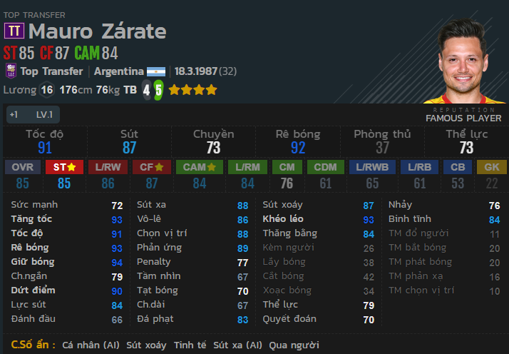 Nếu bạn đang tìm kiếm nguồn lực tấn công tuyệt vời với những yếu tố như tốc độ tốt, dứt điểm, sút xoáy, sút xa tốt, khả năng rê bóng qua người tốt,hãy tìm đến Mauro Zarate TT. Zarate TT là một trong những cầu thủ cực kì đa năng trên hàng tấn công khi có thể hoàn thành xuất sắc các vị trí từ tiền đạo cắm , tiền đạo cánh, tiền vệ tấn công hay thậm chí là hộ công. Với bộ chỉ số cực kì ổn cùng với lượng chỉ số ẩn vô cùng đa dạng, Zarate TT hiện đang là mẫu tiền đạo mùa TT giá rẻ được săn đón hàng đầu của các game thủ Hàn trong việc sử dụng để leo rank xếp hạng.
