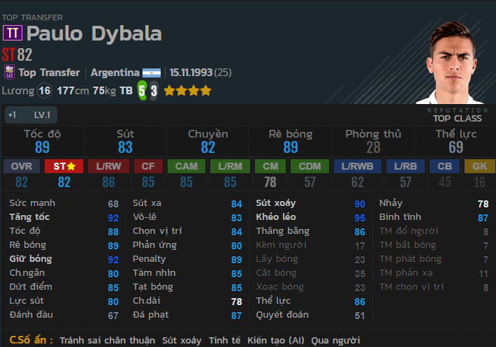 Với đánh giá của phần đông các game thủ chuyên nghiệp, việc Dybala TT đá tiền đạo như theo vị trí mặc định của thẻ là không hề hợp lý chút nào. Lý do là tốc độ cũng như tăng tốc trong game của Dybala TT không được đánh giá cao, gia tốc chậm, dễ bị hậu vệ theo kèm và kéo lại. Tuy nhiên, điểm mạnh đến bất thường của thẻ cầu thủ này lại nằm chính ở khả năng ZD tầm trung cực kì ảo diệu. Mặc dù đã fix nhiều về ZD và sút xoáy của gameplay thì Dybala vẫn gần như khác biệt với phần còn lại. Đường bóng ZD của Dybala là cực kì cong và khó với ngay cả với những top thủ môn hàng đầu. Vị trí nên dùng cho Dybala được đánh giá hợp lý nhất là RAM để tối đa hoá khả năng hỗ trợ tấn công với sút ZD tầm trung.
