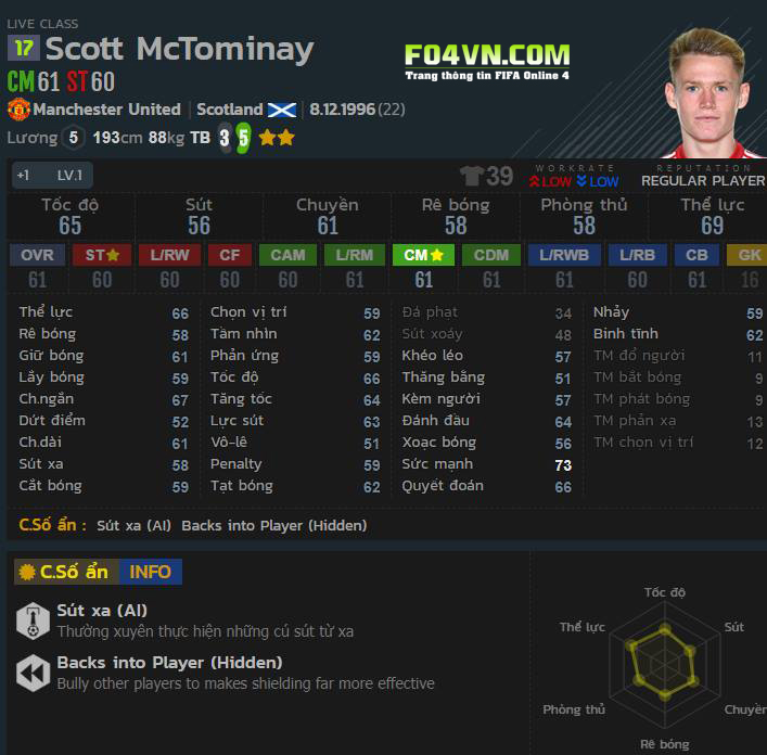 Bước vào game, điều đầu tiên làm mình ấn tượng nhất về McTominay là thể hình đẹp (cao 1m93, nặng 88kg, thể hình TB) và khuôn mặt ingame giống thật (rất đẹp trai) Với những cầu thủ trẻ như thế này, thể hình và chỉ số ẩn là điều quan trọng nhất chứ k phải chỉ số chi tiết. Chỉ số chi tiết thì trắng muốt giống hệt màu da của anh vậy.