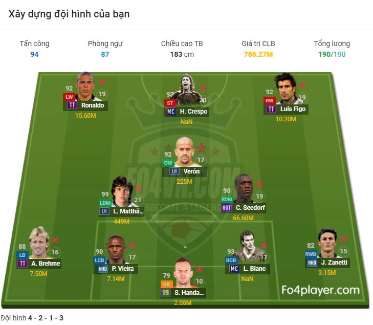 * trên hàng công là bộ ba Crespo (Review) , Ronaldo (review), Figo, với tốc độ của mình Ronaldo được bố trí đá cánh và nhường vị trí trung phong cho Crespo sẽ là hiệu quả hơn. Cánh phải gần như Figo là sự lựa chọn tối ưu nhất với những cú tạt và căng ngang như đặt.