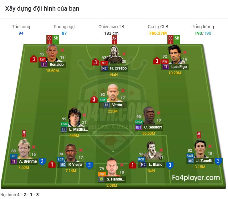 Lối chơi tốc độ cao, phản công nhanh là mấu chốt trong sơ đồ 4213 của Inter Milan trong bài viết này. Không quá cầu kỳ bởi tuyến giữa đa phần là các " công nhân". Bạn hãy tận dụng tốt khả năng căng ngang của Figo trong các tình huống xuống biên.